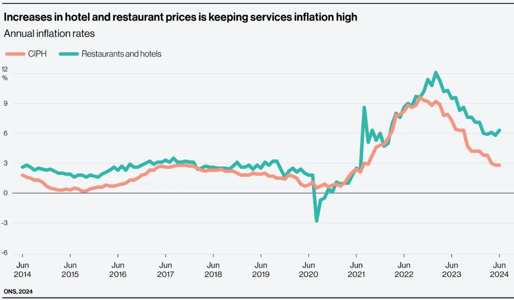 But that headline figure is masking some challenges. While grocery inflation is decreasing and the price of items such as clothing and footwear are falling, services inflation remains high. In restaurants and hotels, inflation was at 6.3 per cent in the year to June, almost entirely caused by an 8.8 per cent increase in the price of hotels.